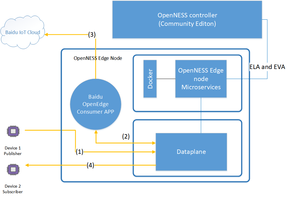 - Baidu OpenEdge: In the example provided, the Smart Edge Open Baidu OpenEdge app is deployed as a pure Consumer app which does not consume any services from producer applications on the edge node. Hence, the Baidu OpenEdge app does not need to call EAA APIs. The app will handle data traffic from/to MQTT devices via the Smart Edge Open dataplane.