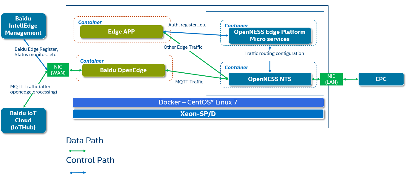 Smart Edge Open is an open-source software toolkit to enable easy orchestration and management of edge services across diverse network platforms and access technologies in multi-cloud environments. Smart Edge Open can integrate with Baidu* Cloud Connector, OpenEdge, which is Edge IoT Gateway. Together with Baidu edge management dashboard, the whole Baidu Edge solution is called Baidu IntelliEdge*. For more details, refer to Baidu’s website: www.baidu.com